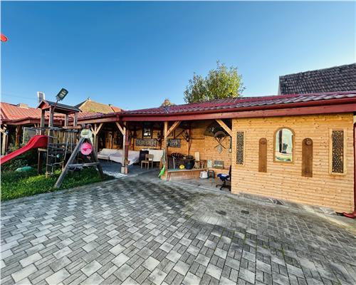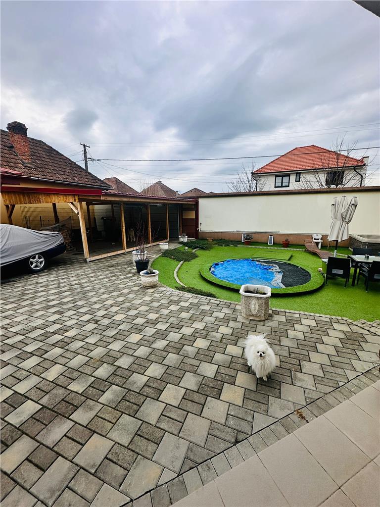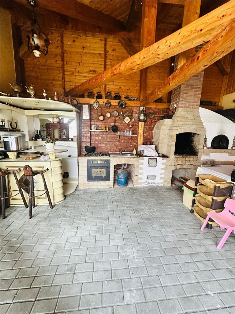 Proprietatea beneficiază de o curte superb amenajată, care include:Zonă de relaxare exterioară: O terasă acoperită și un spațiu de tip foișor/bucătărie de vară rustică, dotată cu grătar zidit, cuptor tradițional și zonă de bar – locul ideal pentru evenimente private.Grădină amenajată: Design rustic, cu accente calde si finisaje de calitate amenajata complet – gazon impecabil, vegetație matură și un iaz decorativ cu pesti care aduce un plus de prospețime și eleganță peisajului, carport auto, magazie. Acces facil din strada asfaltata si iluminata